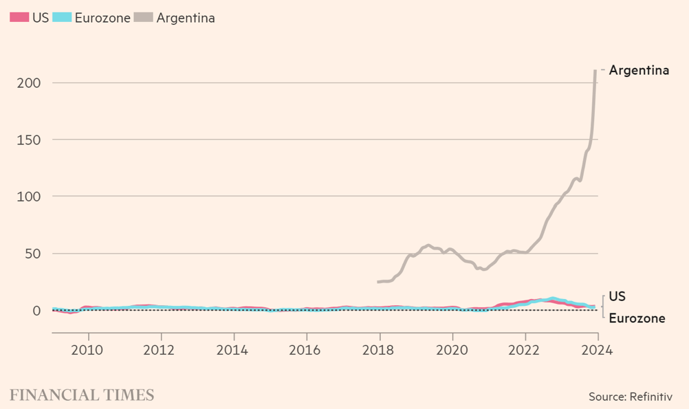 Note: Argentina’s inflation metrics pre 2016 were not recognised by independent bodies due to unreliable official figures, with critics accusing the government of manipulating statistics.