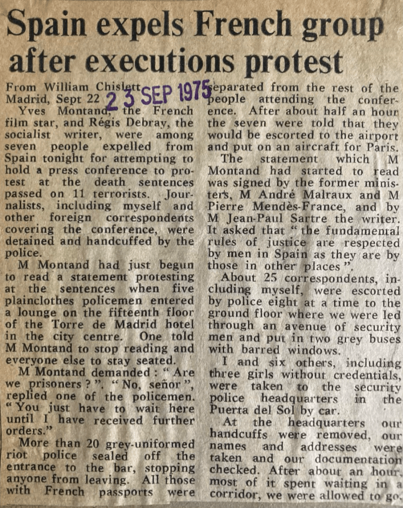 No sólo había asistido a una rueda de prensa ilegal (celebrada en la planta 15 del hotel Torre de Madrid, en la Plaza de España), sino que ese día no llevaba conmigo mi credencial de prensa extranjera. Los franceses fueron conducidos al aeropuerto de Barajas y deportados, y a mí me detuvieron sin incidentes durante aproximadamente una hora. Puede que el hecho de no ser español me salvara de un trato más duro. The Times publicó el 23 de septiembre mi reportaje y una foto en la revista Cambio-16 me mostraba sentado con los franceses antes de que irrumpiera la policía.