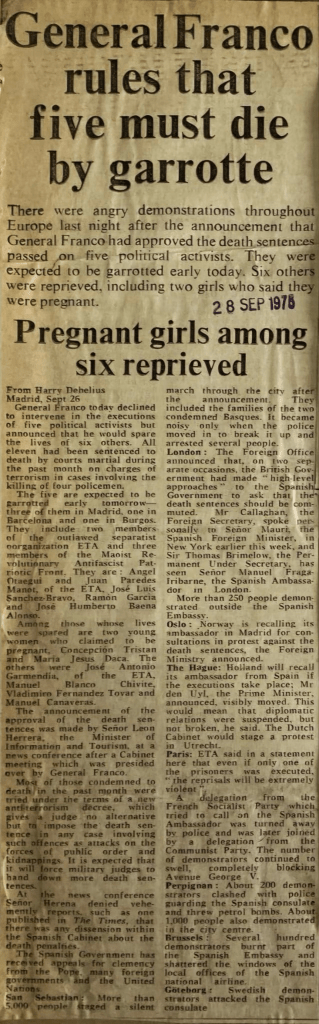 La prensa extranjera y española dio por hecho que los cinco activistas políticos (dos de ETA y tres del FRAP) serían ejecutados a garrote. En realidad fueron fusilados. Franco perdonó la vida a los otros seis, entre ellos dos mujeres que dijeron estar embarazadas. Fueron encarcelados. El garrote, un método bárbaro que data de la Edad Media en forma de cuerda o cinturón para estrangular que más tarde evolucionó hasta convertirse en un torpe instrumento mecánico, se había utilizado por última vez en España en 1974 para ejecutar a un anarquista catalán, Salvador Puig Antich. Tardó 12 minutos en morir.