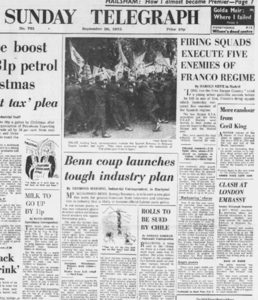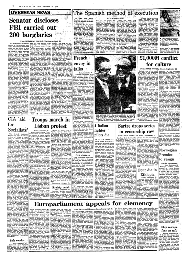 La prensa británica, a diferencia de la española, era libre de informar de lo que quisiera, y cubrió ampliamente y de forma destacada, a menudo en primera página, el período previo a las ejecuciones y las ejecuciones mismas. Yo trabajaba con el veterano periodista Harry Debelius (llegó a España en 1955), que informó de que ocho ministros de Franco amenazaron con dimitir si se llevaban a cabo las ejecuciones. Ese reportaje hizo que un periodista del diario ABC le llamara por teléfono para hablar de su crónica. En aquella época era bastante habitual que la prensa española informara de lo que decía la prensa extranjera sobre temas controvertidos en España, en lugar de escribir directamente y enfrentarse a posibles sanciones. El diario vespertino Informaciones, el más liberal de su época, publicó en portada el informe de Debelius. El ministro de Información lo tachó de «cuento de hadas».