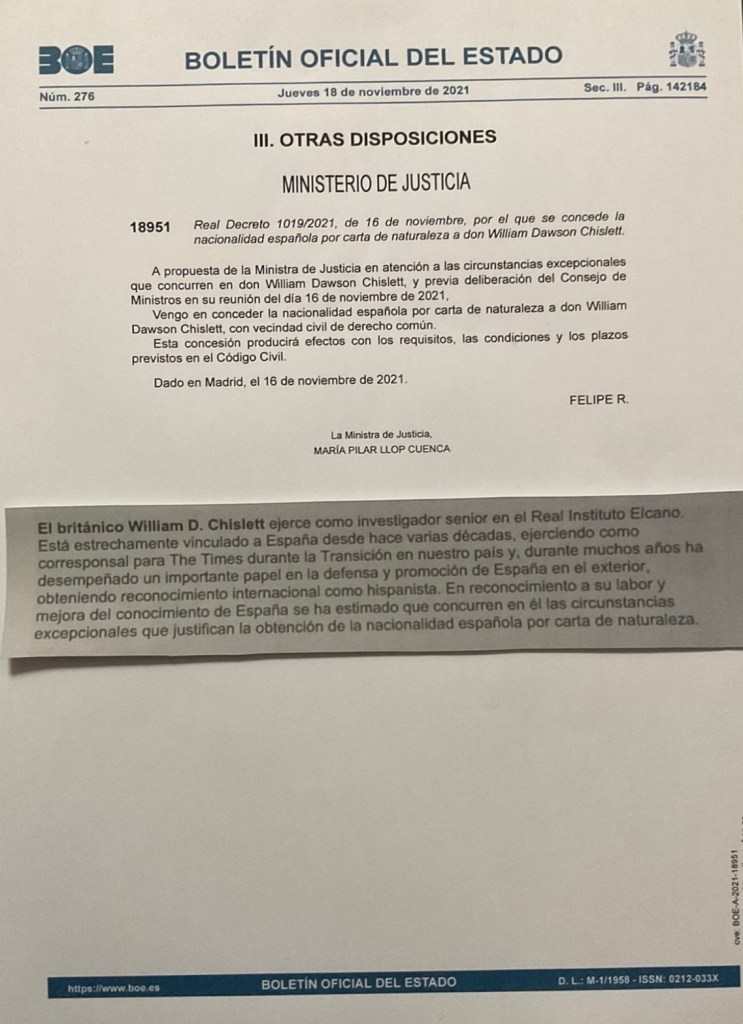 In late 2020, three friends – the lawyer José Manuel Romero Moreno, the novelist Antonio Muñoz Molina and the sociology professor, Emilio Lamo de Espinosa, offered to be my padrinos and back my nationality via a faster and easier route known as Carta de Naturaleza. This route is based on a person’s particular circumstances: granting nationality this way is the prerogative of the Cabinet via a Royal Decree, signed by King Felipe VI.