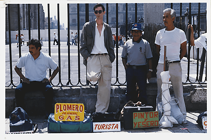 As we focus on the information within the photograph, this evidences a meditation on violence as well as on Mexico and Latin America themselves. The photograph was taken in the centro histórico, not far from the Tepito neighbourhood, which is notorious for its levels of crime and violence (amplifying the level of danger as well for Alÿs, who is undertaking this risky act in the name of art). He is casually dressed – looking different from his “professional tourist” photograph (below) that he took just adjacent to the Zócalo (main square) where other professionals (such as plumbers and carpenters) wait for work in another artistic performance that he staged around that same time.