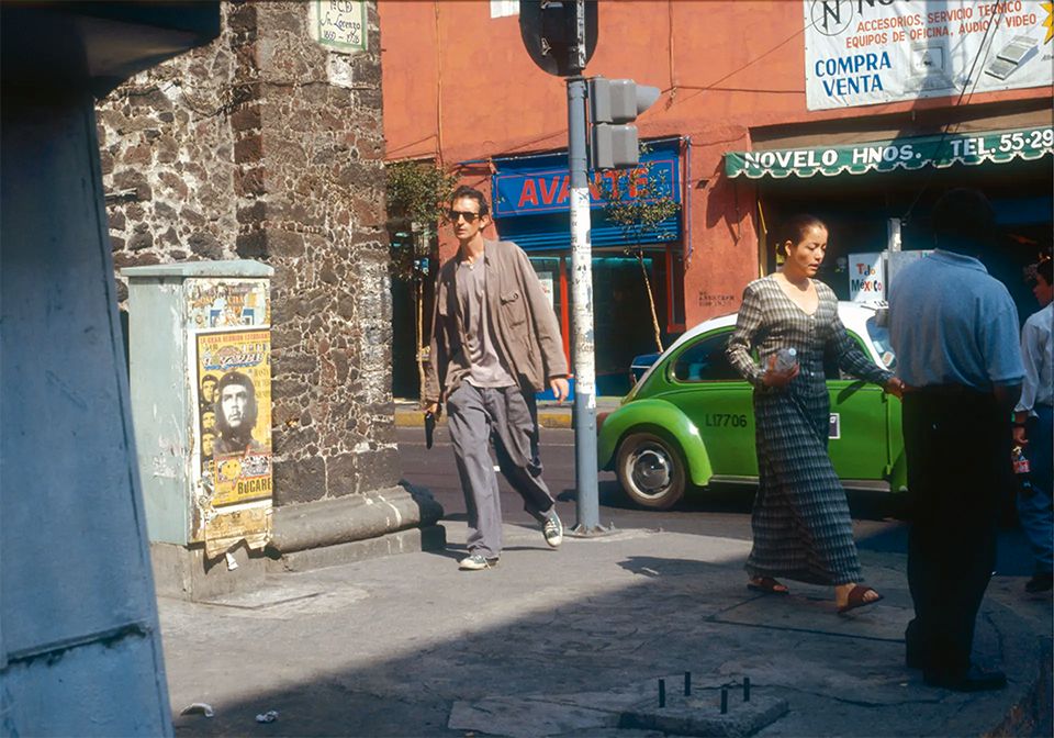 Another less subtle reference to the Mexico City location is the taxi cab. Though still recognizable in monochrome representations, the colour images help the viewer to recognize the scene as one from the capital because the green Volkswagen Beetle was at that time the most common taxi cab in the city.