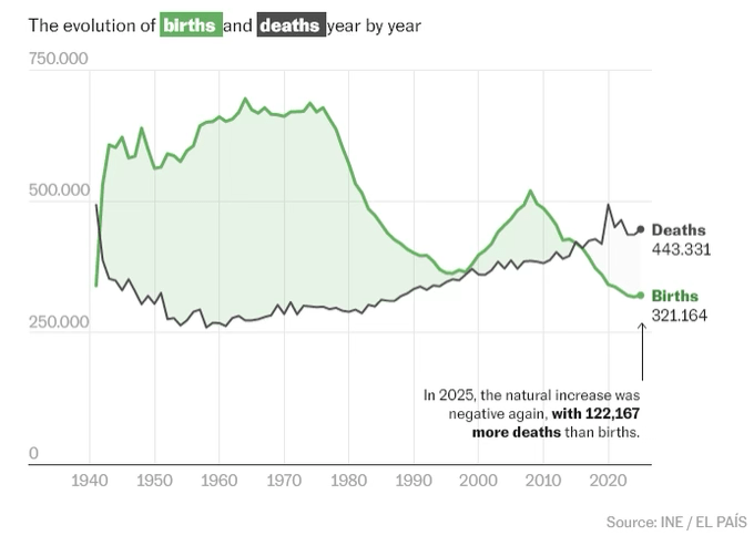 In 1996 the United Nations forecast that by 2050 the total population of Spain would fall from almost 40 million to 28-30 million unless trends changed. They did, and significantly: the foreign-born population surged from 542,314 in 1996 (1.4% of the total population) to just over 10 million in 2025 (20%, higher than in France and Italy, and comparable to Germany).