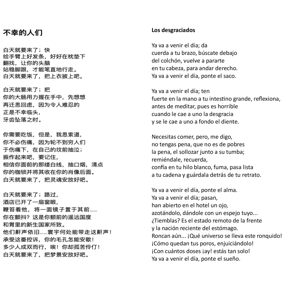 Here is an example of one of Vallejo’s poems, “The Wretched”, translated into Chinese by 卢卡 (Zhu Xianqian):
