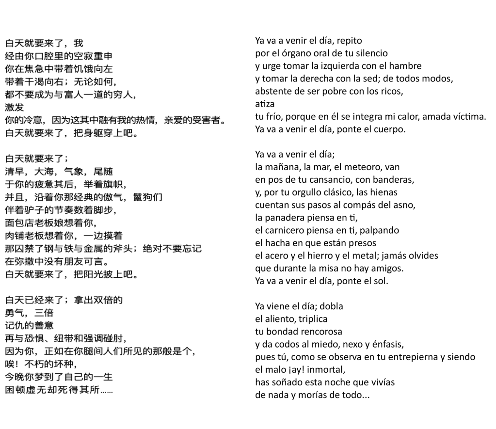 We also felt that, in the sixth stanza, it would be preferable to draw attention, perhaps in the form of a footnote, to the Christian leitmotif of Christ described as bread/body and wine/blood in Holy Communion, as well as the trinitarian associations of “miedo, nexo y énfasis” in the sixth and final stanza. Zhu Xianqian, the translator, decided to use some linguistic devices and techniques from ancient Chinese poetry – in which words are deliberately used in such a way as to have multiple meanings – in the translation in order to echo the multiple meanings and associations evoked by Vallejo’s poem. The general assessment was that, despite the superficial alienness for a Chinese reader of some of the leitmotifs in the poem – such as, in particular, the description of the Christian rite of Holy Communion which is, furthermore, treated in a creative manner as if the baker and the butcher were really about to kill their victim during the Mass – other rhetorical ways of bridging the gap were found.