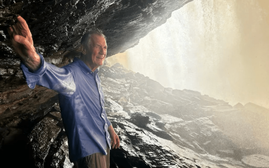 Barefoot on a slippery ledge a few metres behind the thunderous torrent of the Canaima Falls in Venezuela’s Amazon region, the beaming presenter clings to a rocky overhang and hollers to camera, “I’m 81 – I shouldn’t be here!”
