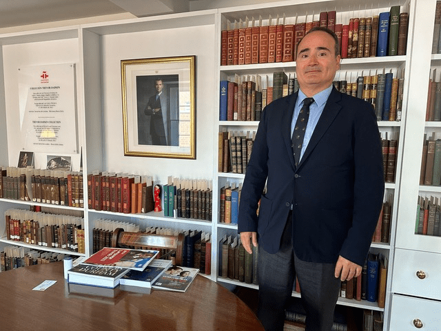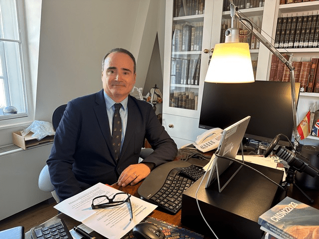 Su perfil académico y profesional nos muestra a un auténtico todo terreno: por un lado, graduado en Historia del Arte y, por otro, curtido desde muy temprano en la gestión del día a día de diversas instituciones privadas y públicas. Una perspectiva holística, ideal para la difícil labor de promover académica y casi comercialmente la lengua y la cultura hispana. Y es que, para empezar, el nuevo director del Instituto Cervantes de Londres de idiomas sabe un rato: inglés, japonés, italiano, y, por supuesto, español ilustran su currículum. Visitamos al nuevo inquilino del imponente y laberíntico edificio de Devereux Court, a un paso de la estación de metro Temple, uno de los primeros días lluviosos del otoño. Algo que nos hace recordar a ambos la misma lluvia de 365 días atrás cuando Ugarte aterrizaba en una capital británica impactada por el fallecimiento de la Reina Isabel II.